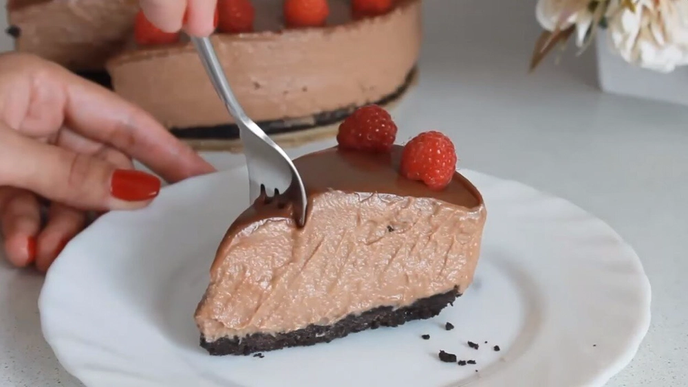 Indi torty islegiňize görä bezäp bilersiňiz. Başgaça bolsa, tortuň üstüne gaýmak bilen garylan ýyly şokolad guýuň we üstüne miweleri goýuň. Bir sagat sowadyjyda saklaň. Tortyňyz taýýar.