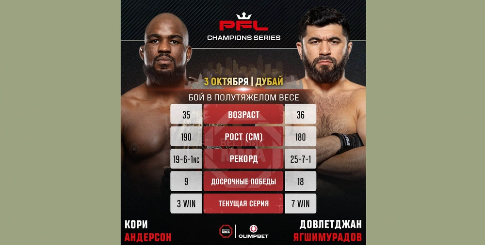 Şu gün — 3-nji oktýabrda BAE-niň Dubaý şäherinde «PFL Champions Series 3» ýaryş agşamy geçirilip, onuň iň gyzykly bölegi söweş sungatlarynyň garyşyk görnüşiniň türkmen ussady Döwletjan Ýagşymyradow bilen Kori Andersonyň arasyndaky duşuşyk bolar. Ildeşimiz jogap duşuşygynda güýçli garşydaşyny ýeňmek hem-de çempionlyk adyny goramak isleýär.