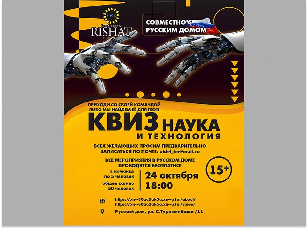 24-nji oktýabrda Aşgabatdaky Rus öýünde ylma we tehnologiýalara bagyşlanan toparlaýyn intellektual (aň-paýhas) oýny guralar. Bu barada «t.me/asgabatrus» sahypasynda habar berildi.