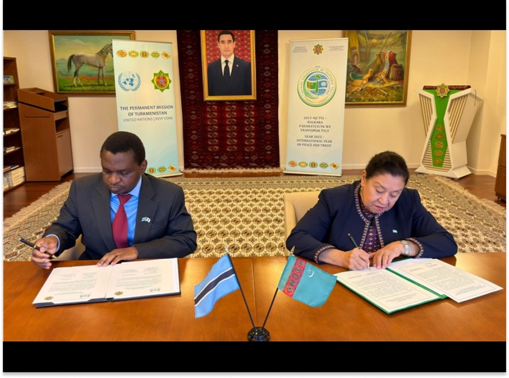 20-nji oktýabrda Nýu-Ýork şäherinde Türkmenistanyň Birleşen Milletler Guramasynyň ýanyndaky hemişelik wekilhanasynyň binasynda Türkmenistan bilen Botswana Respublikasynyň arasynda diplomatik gatnaşyklary ýola goýmak hakyndaky Bilelikdäki Beýanata gol çekmek dabarasy geçirildi.