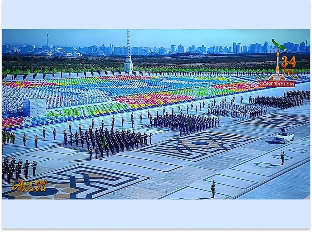 Aşgabadyň Döwlet münberiniň toplumynyň öňündäki meýdançasynda Türkmenistanyň Garaşsyzlygynyň 34 ýyllygy mynasybetli baýramçylyk ýörişi guraldy.