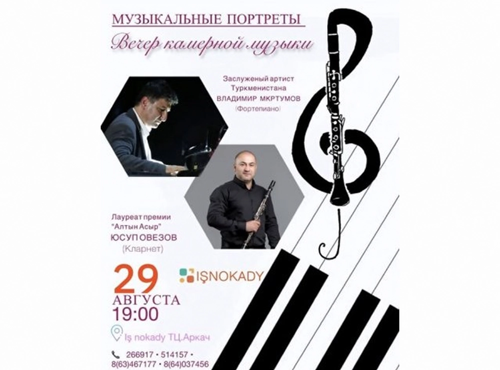 29-njy awgustda «Arkaç» söwda we dynç alyş merkezindäki «Iş Nokady» koworking merkezinde Türkmenistanyň at gazanan artisti W.Mkrtumowyň hem-de «Türkmeniň Altyn asyry» bäsleşiginiň ýeňijisi Ý.Öwezowyň gatnaşmagynda «Aýdym-saz portretleri» diýen at bilen kamera aýdym-sazlarynyň agşamy guralar.