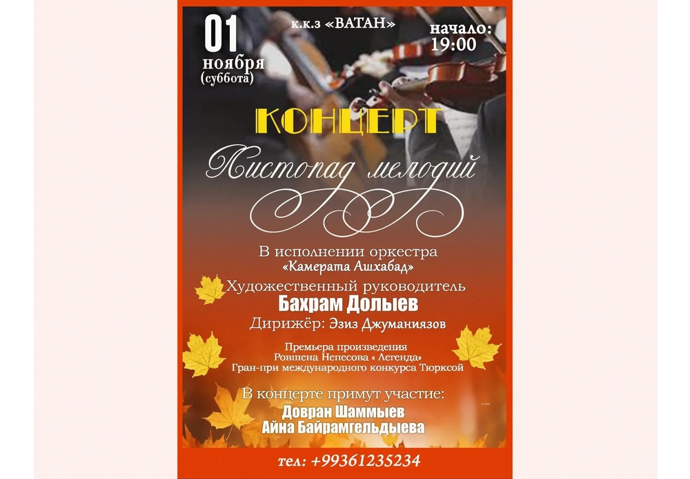 1-nji noýabrda «Watan» kinokonsert merkezinde ajaýyp owazlar belentden ýaňlanar. Bu ýerde «Kamerata Aşgabat» orkestriniň ýerine ýetirijileriniň çykyşlary hödürlener.