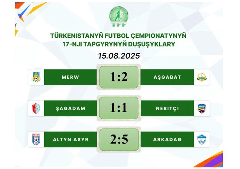 15-nji awgustda Türkmenistanyñ futbol çempionatynyñ 17-nji tapgyrynyň oýunlary geçirildi. «Aşgabat» myhmançylykda «Merwi» 2:1 hasabynda ýeňdi. «Arkadag» topary bolsa «Altyn Asyrdan» 5:2 hasabynda üstün çykdy. Balkan welaýatynyň toparlarynyň bolsa her biri 1 utuk aldy.