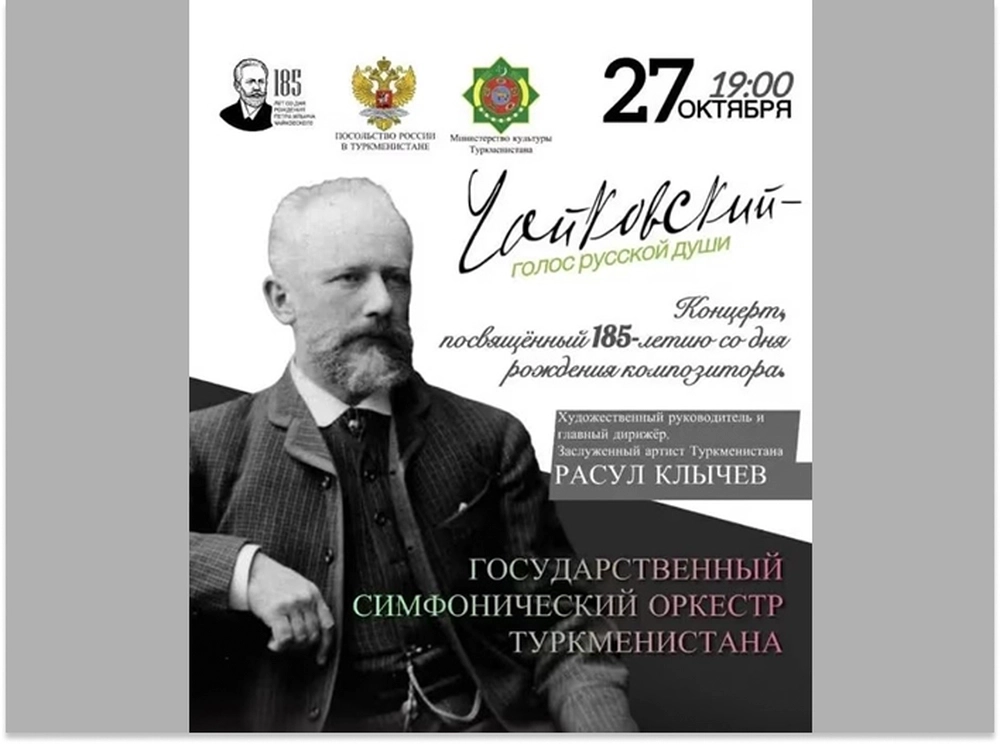 Russiýa Federasiýasynyň ilçihanasy hem-de Türkmenistanyň Medeniýet ministrligi tarapyndan guralýan konsert Magtymguly adyndaky milli sazly-drama teatrynda geçer.