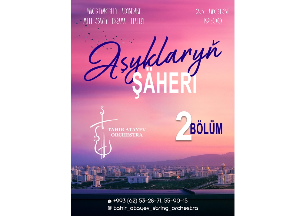 Diňleýjileriň köp sanly islegleri esasynda Tahyr Ataýewiň ýolbaşçylygyndaky meşhur orkestr täze konserti bilen gaýdyp gelýär. «Aşyklaryň şäheri. 2-nji bölüm» atly liriki taslamanyň dowamy 23-nji awgustda sagat 19:00-da paýtagtymyzyň Magtymguly adyndaky milli sazly-drama teatrynda guralar.