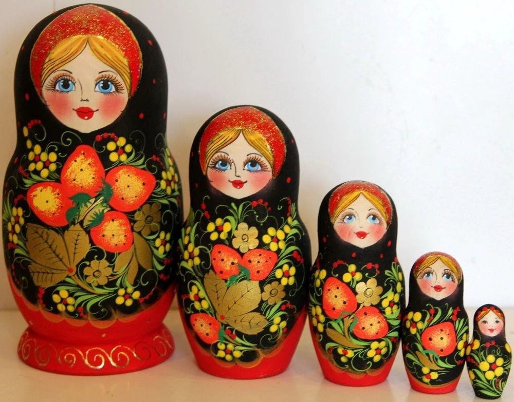 Матрёшка — русская деревянная игрушка в виде расписной куклы, внутри которой находятся подобные ей куклы меньшего размера. Число вложенных кукол — обычно три и более. Обычно имеют форму яйца с плоским донцем и состоят из двух разъёмных частей, верхней и нижней. На традиционных матрёшках изображена женщина в красном сарафане и платке. В наше время темы для росписи разнообразны: сказочные персонажи, девушки, а также семьи.