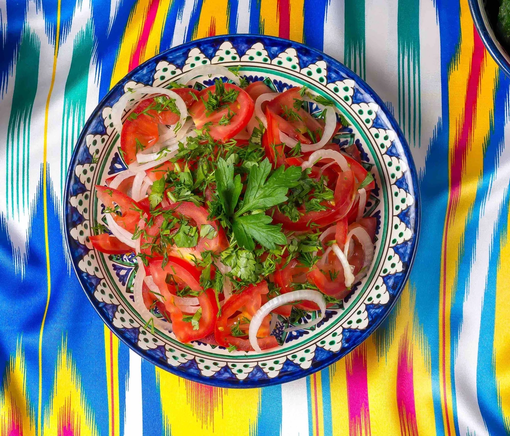Салат Ачучук относится к узбекской кухне и, чаще всего, он подается не как самостоятельное блюдо, а в качестве дополнения к плову. Рецепт прост и рассчитан на то, чтобы приготовить закуску за несколько минут, пока горячее выкладывают на большую тарелку. Сделать салат совсем несложно, ведь в его состав входят всего четыре ингредиента: помидоры, острый перец, красный лук и базилик. Продукты тонко нарезаются и выкладываются рядом с пловом. Иногда салат Ачучук даже маслом не заправляют, но вы можете поступить так, как больше нравится.