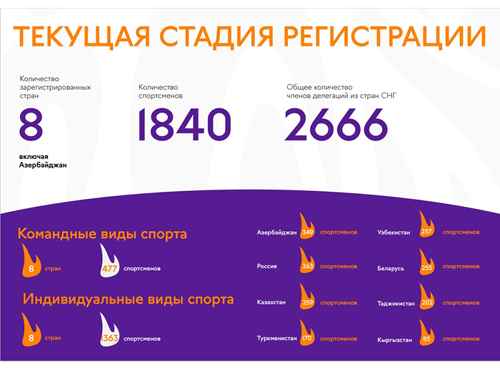 В предстоящих III Играх стран СНГ кроме азербайджанских спортсменов примут участие представители еще ряда стран, включая Туркменистан. В настоящее время продолжается регистрация делегаций.