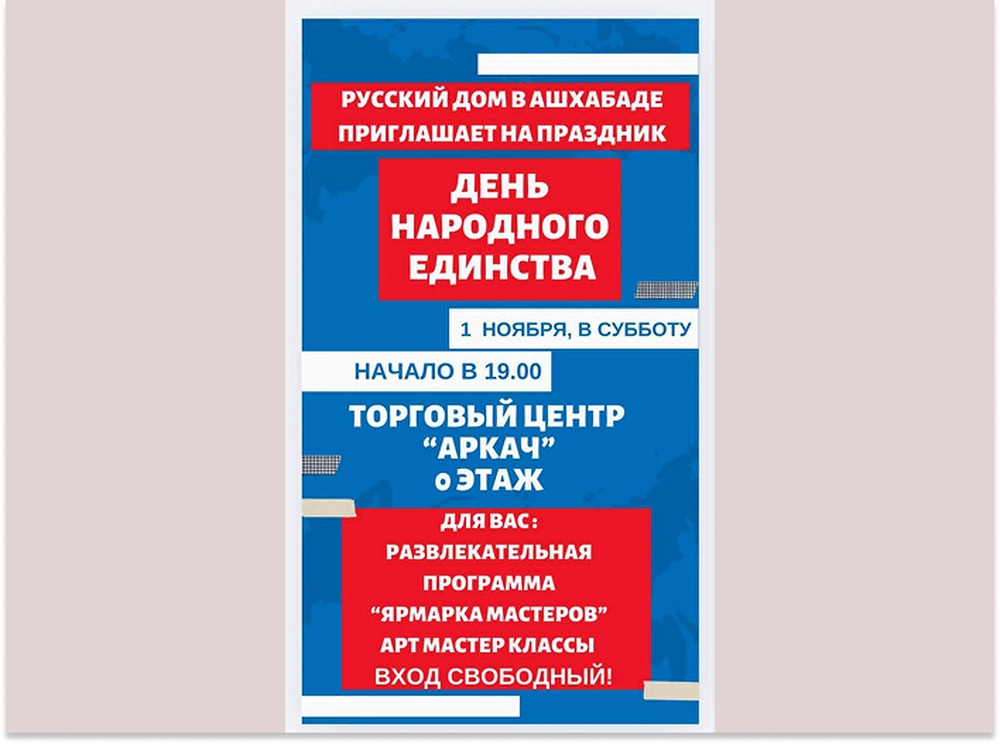 Русский дом в Ашхабаде приглашает всех 1 ноября в Торгово-развлекательный центр «Аркач» на праздничное мероприятие, посвящённое Дню народного единства.