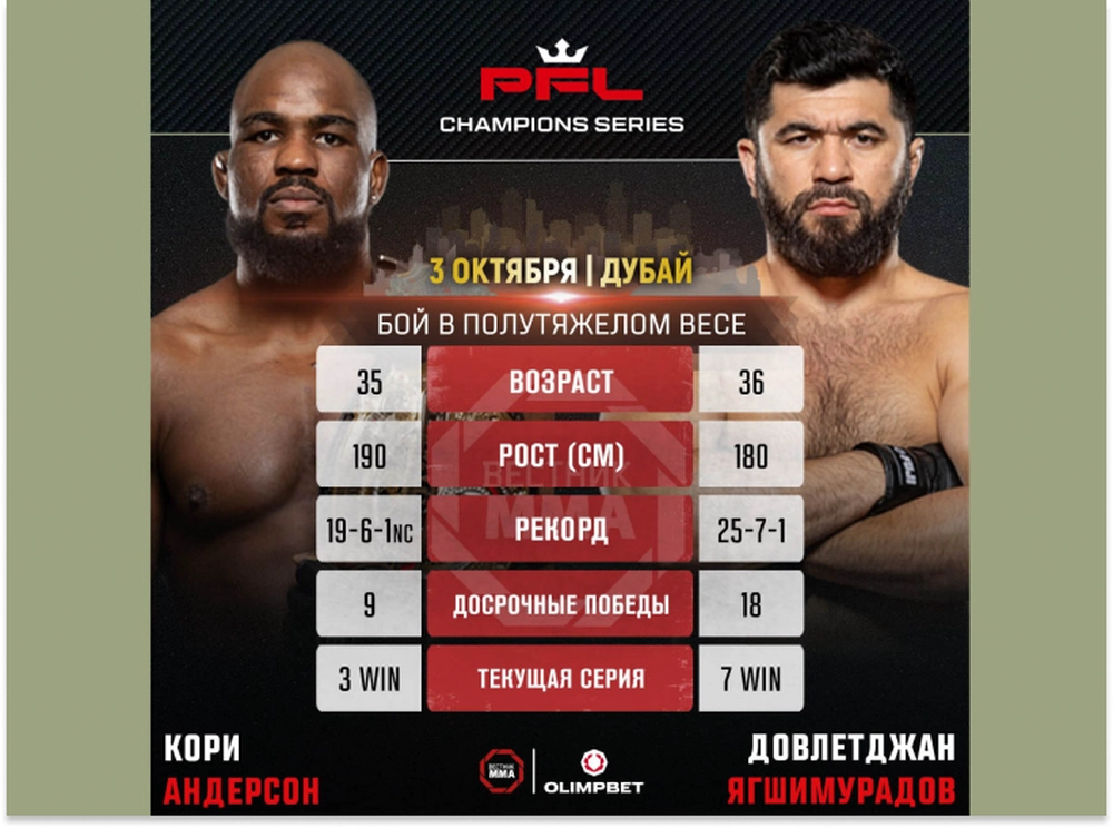 Сегодня, 3 октября, в Дубае на турнире PFL Champions Series 3 состоится громкий реванш – Довлетджан Ягшимурадов попытается отомстить старому обидчику Кори Андерсону, а заодно и защитить титул.
