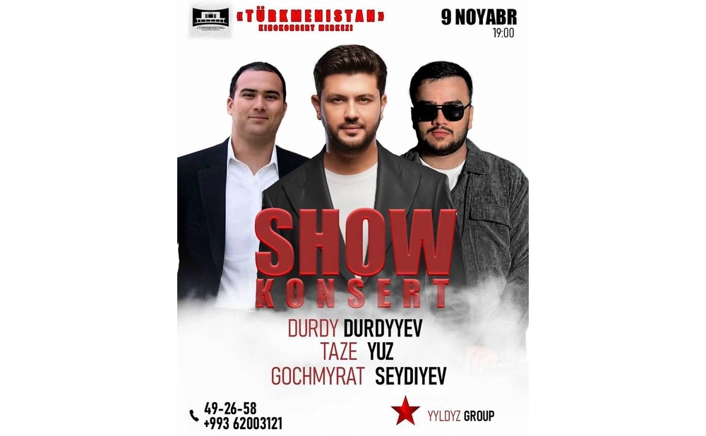 9 ноября в киноконцертном зале «Туркменистан» состоится концерт, который обещает стать настоящим праздником для любителей хорошей музыки. В этот вечер прозвучат великолепные песни талантливого певца Дурды Дурдыева, а также известного туркменского рэпера Taze Yuz. Вести этот концерт будет Гочмырат Сейдиев.