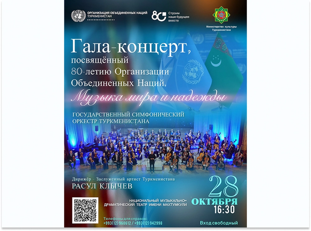 28 октября на сцене Национального музыкально-драматического театра имени Махтумкули состоится Гала-концерт под символическим названием «Музыка мира и надежды», посвященный 80-летию Организации Объединенных Наций.