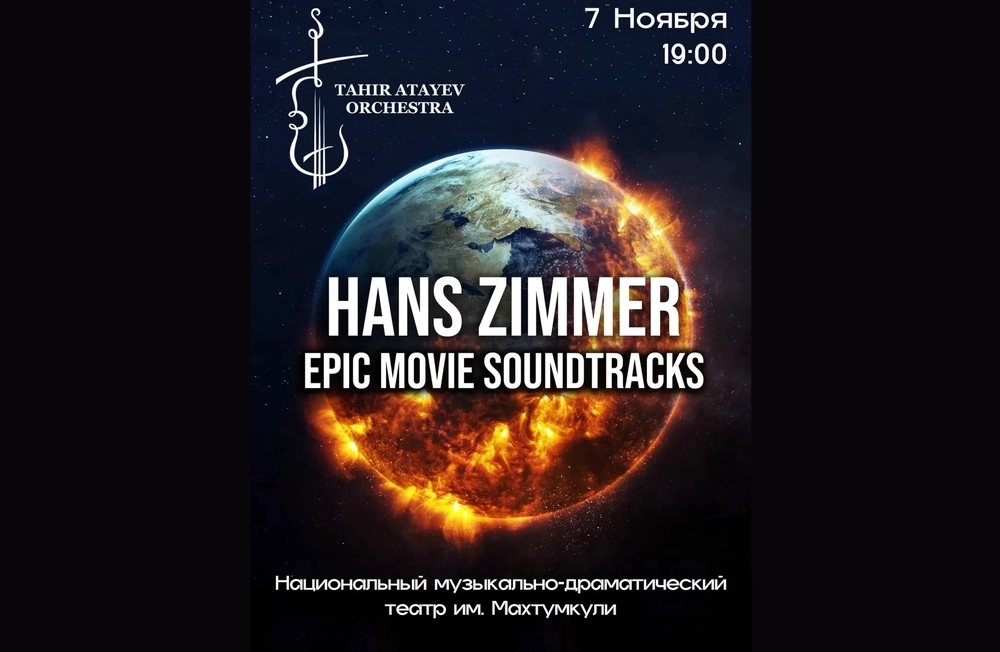 В Национальном музыкально-драматическом театре имени Махтумкули прозвучит музыка из таких эпических фильмов, как «Гладиатор», «Начало», «Интерстеллар» и «Пираты Карибского моря». Великолепные произведения знаменитого кинокомпозитора Ханса Циммера непременно поднимут вам настроение.
