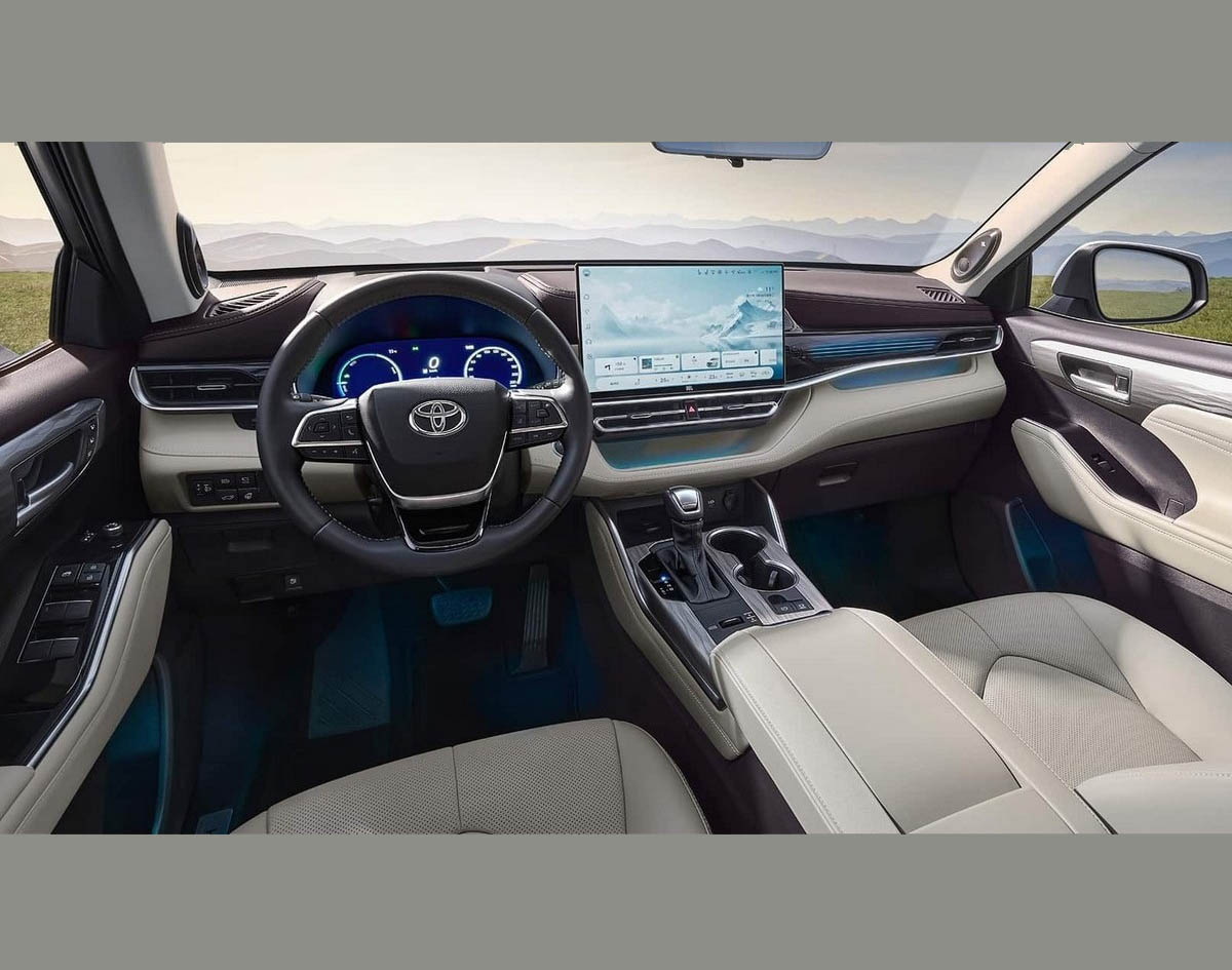 Здесь появилась полностью новая центральная секция передней панели с крупным безрамочным экраном медиасистемы на 15,6 дюйма (прежде на выбор были экраны диагональю 10,25 или 12,3 дюйма). Правда, одновременно Toyota Highlander лишилась отдельного блока климат-контроля с кнопками и вращающимися рукоятками: все управление теперь в меню. Зато появились беспроводная зарядка мощностью 50 ватт и развитая контурная подсветка. Изменены материалы отделки интерьера, в том числе крупные декоративные накладки.