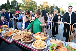 Центром внимания стала древняя туркменская юрта - просторная, украшенная коврами ручной работы, с орнаментами, хранящими дыхание пустыни и вековую историю народа. Гости, войдя внутрь, словно переносились в атмосферу кочевого быта и тёплого домашнего очага. У накрытых вокруг юрты столов всех угощали блюдами туркменской кухни - ароматным пловом, сочными лепёшками, сладостями и другими блюдами, приготовленными по старинным рецептам.